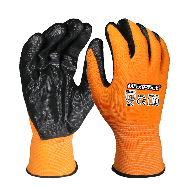 The palm is coated with wear-resistant nitrile, which has excellent anti-slip performance and is suitable for working in oily and slippery environments. It is widely used in industries such as petroleum, construction, and heavy machinery. The overall glove has a high fit and good breathability, suitable for long-term wear.
